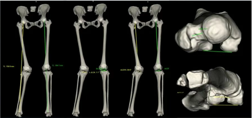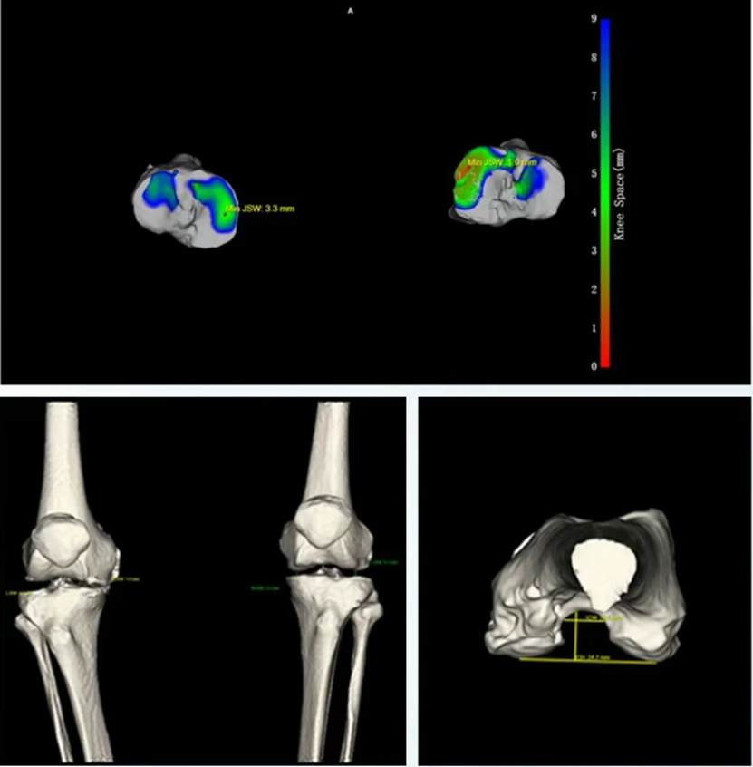Supports MPR-based 3D reconstruction and AI evaluation of parameters such as medial/lateral joint space width, JLCA, joint gap heat map, intercondylar notch width/height, and notch width index.