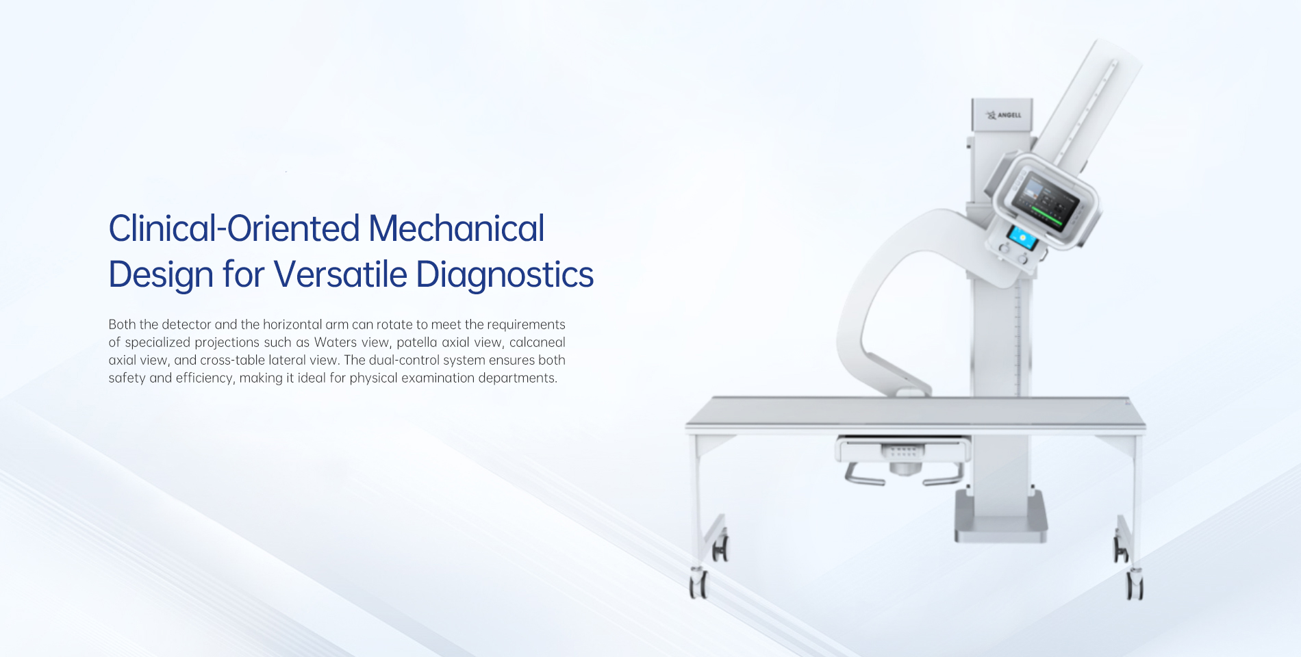 Both the detector and the horizontal arm can rotate to meet the requirements of specialized projections such as Waters view, patella axial view, calcaneal axial view, and cross-table lateral view. The dual-control system ensures both safety and efficiency, making it ideal for physical examination departments.