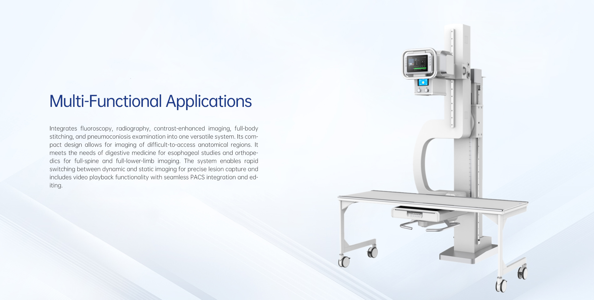 Integrates fluoroscopy, radiography, contrast-enhanced imaging, full-body stitching, and pneumoconiosis examination into one versatile system. Its compact design allows for imaging of difficult-to-access anatomical regions. It meets the needs of digestive medicine for esophageal studies and orthopedics for full-spine and full-lower-limb imaging. The system enables rapid switching between dynamic and static imaging for precise lesion capture and includes video playback functionality with seamless PACS integration and editing.