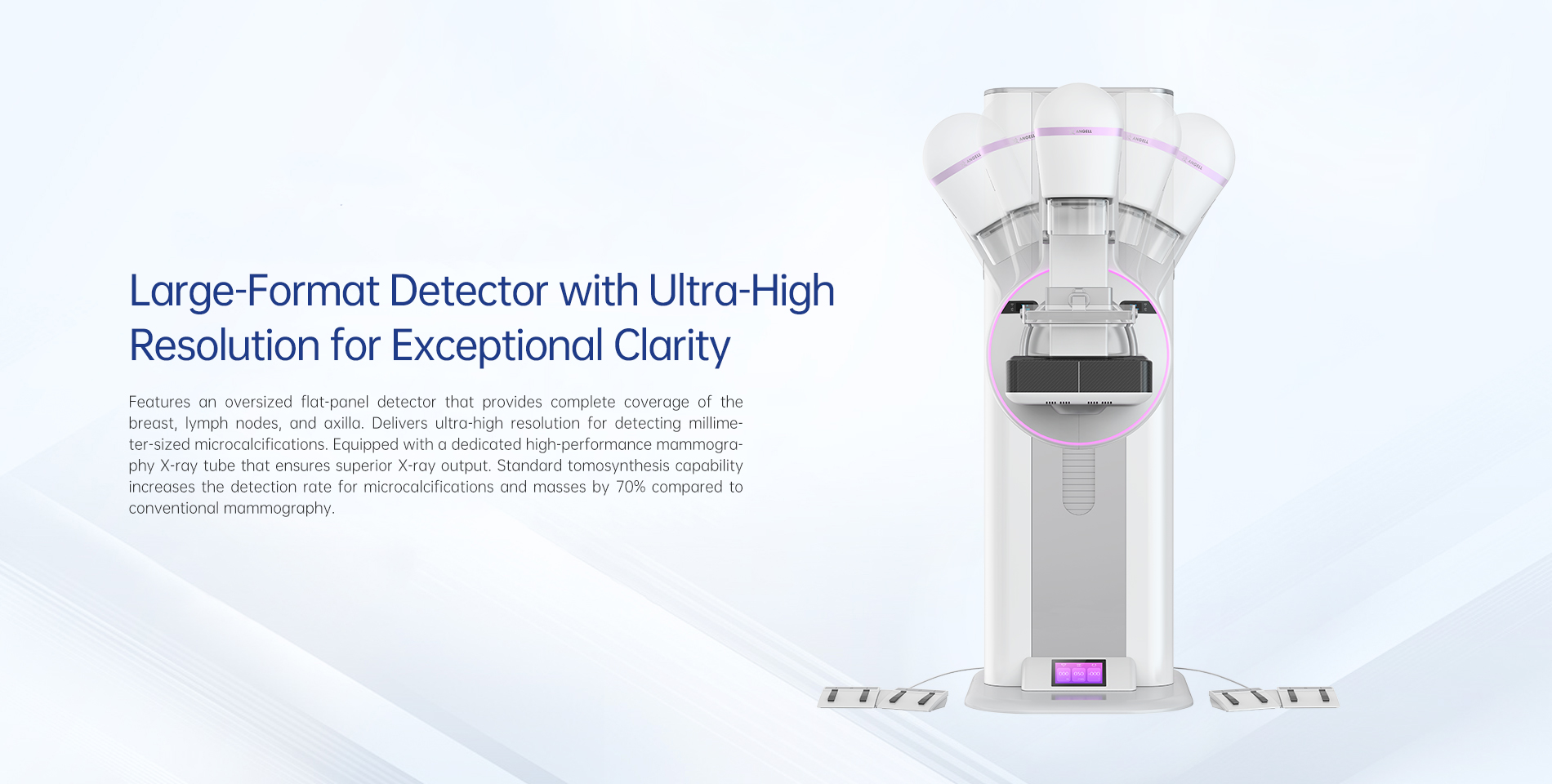 Features an oversized flat-panel detector that provides complete coverage of the breast, lymph nodes, and axilla. Delivers ultra-high resolution for detecting millimeter-sized microcalcifications. Equipped with a dedicated high-performance mammography X-ray tube that ensures superior X-ray output. Standard tomosynthesis capability increases the detection rate for microcalcifications and masses by 70% compared to conventional mammography.