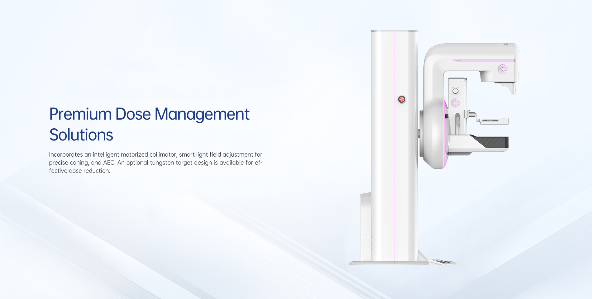 Incorporates an intelligent motorized collimator, smart light field adjustment for precise coning, and AEC. An optional tungsten target design is available for effective dose reduction.