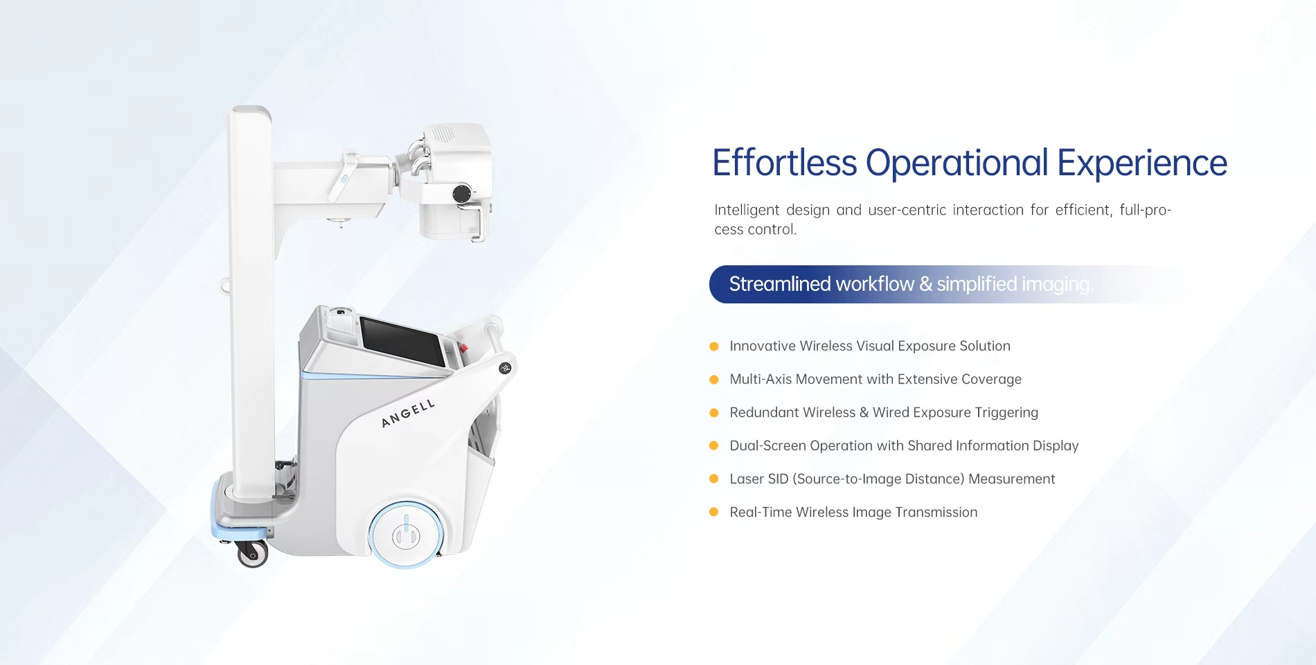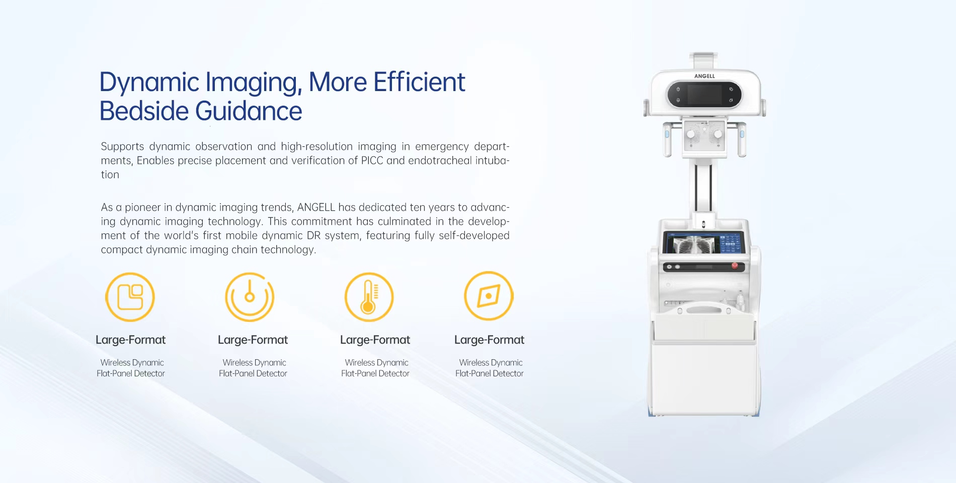 As a pioneer in dynamic imaging trends, ANGELL has dedicated ten years to advancing dynamic imaging technology. This commitment has culminated in the development of the world's first mobile dynamic DR system, featuring fully self-developed compact dynamic imaging chain technology.
