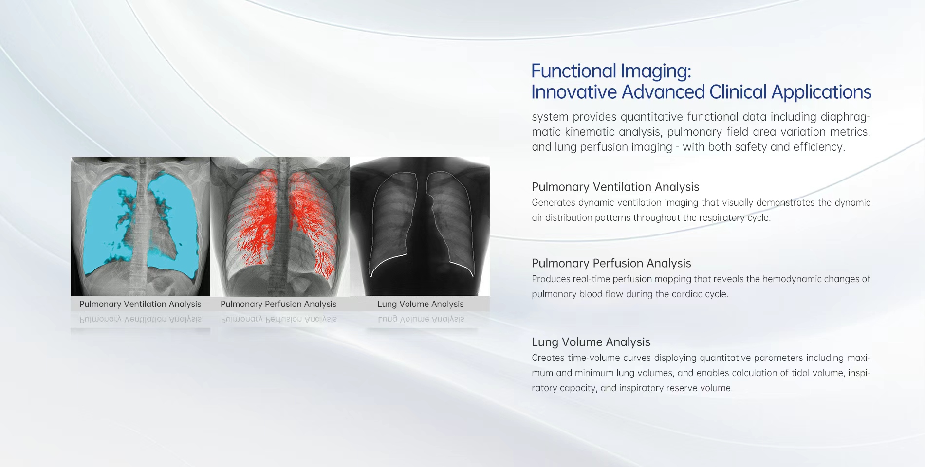 The system provides quantitative functional data including diaphragmatic kinematic analysis, pulmonary field area variation metrics, and lung perfusion imaging - with both safety and efficiency.