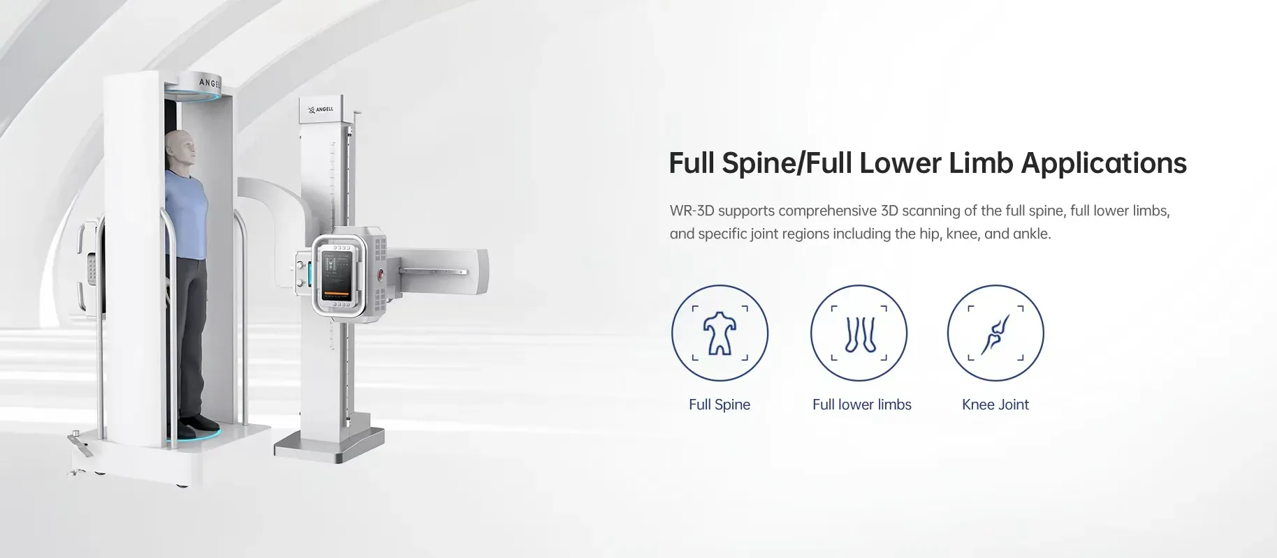 WR-3D supports comprehensive 3D scanning of the full spine, full lower limbs, and specific joint regions including the hip, knee, and ankle.