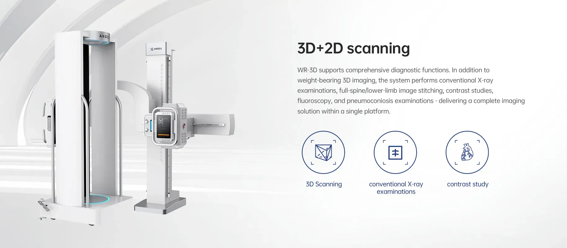 WR-3D supports comprehensive diagnostic functions. In addition to weight-bearing 3D imaging, the system performs conventional X-ray examinations, full-spine/lower-limb image stitching, contrast studies, fluoroscopy, and pneumoconiosis examinations - delivering a complete imaging solution within a single platform.